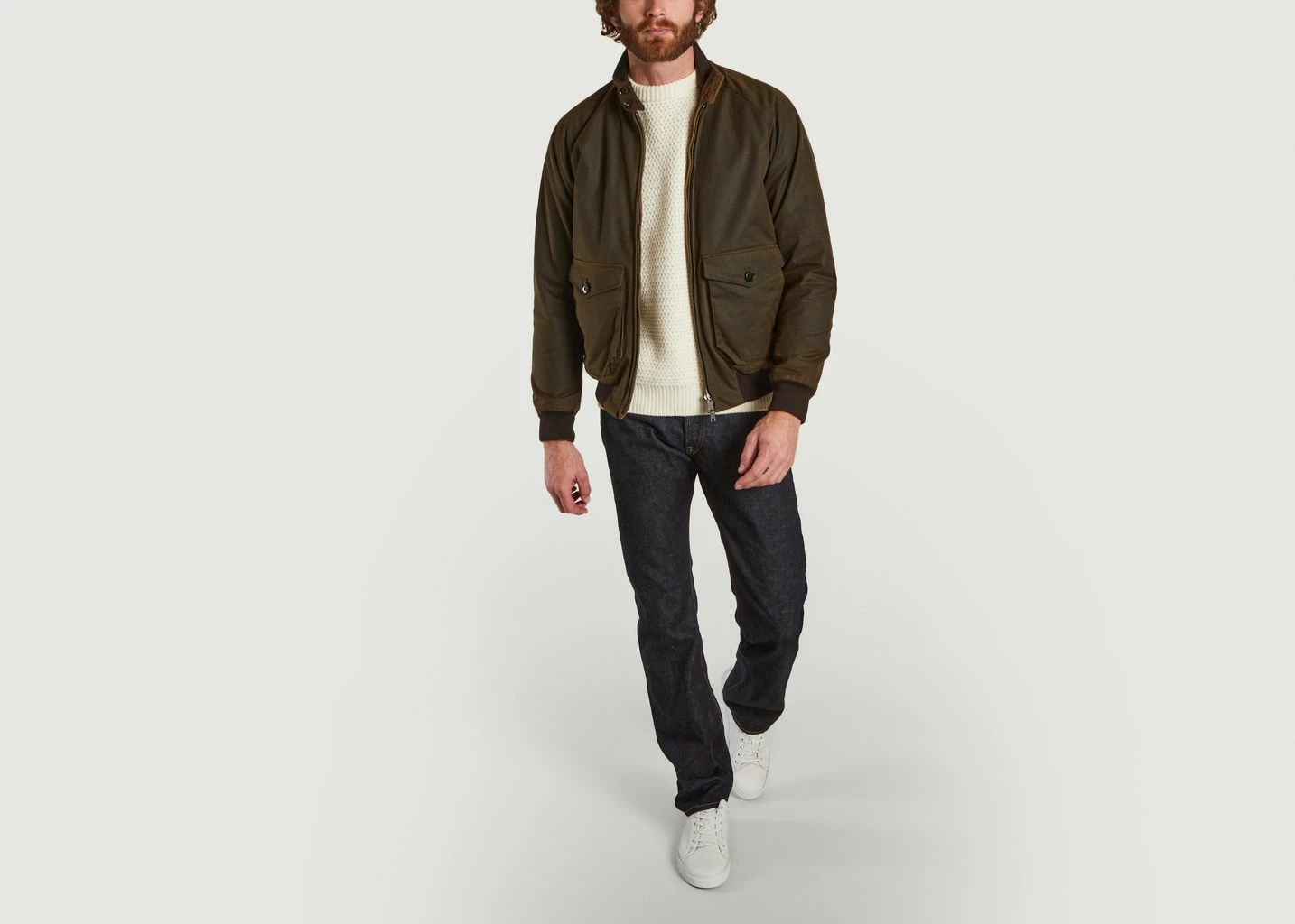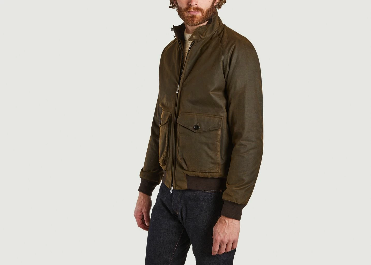 Khaki green jacket with orange lining. Made of 100% cotton. Lining : 100% Polyester. Lining 2: 55% Polyester 45% Viscose. Insulation : 100% Polyester. High collar with buttoned fastening, ribbed waist and sleeves, two pockets with central flaps. Double central zip. Get through the winter with peace of mind and style. A men’s classic inspired by the distinguished British mood. Pair it with a pair of washed straight cut jeans and a pair of low top sneakers.