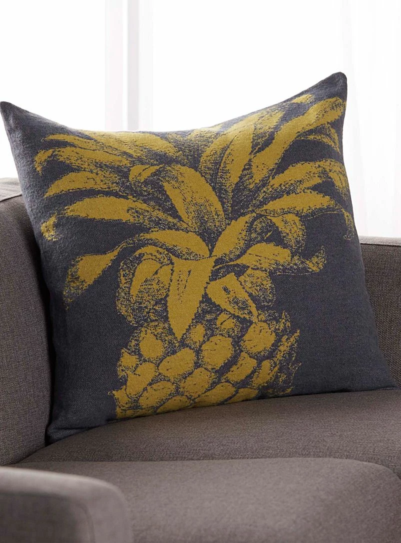 This super cosy large cushion is designed and made in Austria by David Fussenegger Textiles. A graphic and modern interpretation of the trendy tropical fruit, printed in an accent stencil-like chartreuse hue on a charcoal grey background. – Ultra soft and silky weave – Matching solid colour at the back .