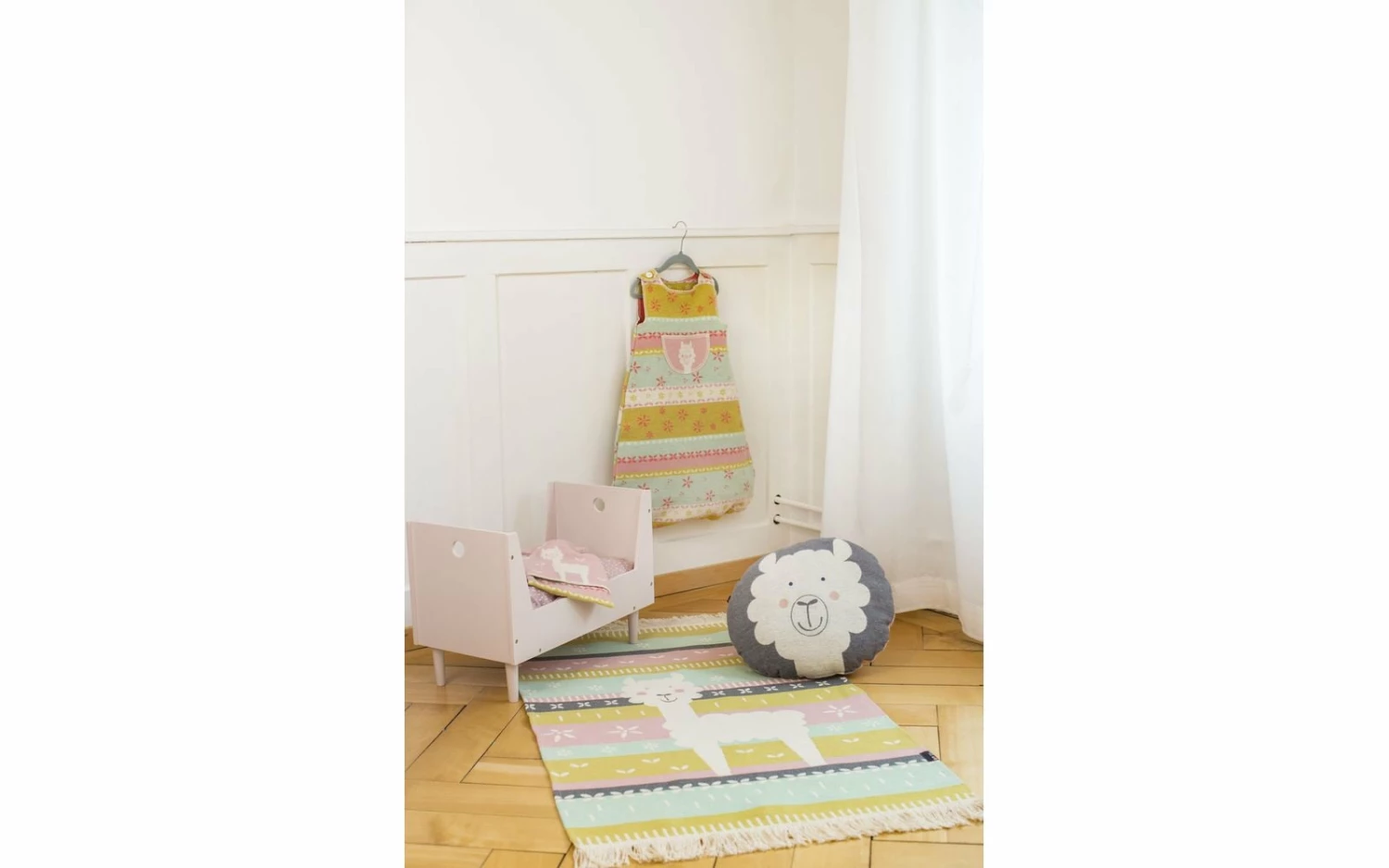 This lovely carpet with its pastel llama print brings joy into every child’s room. The cotton used in this product is 100% organic. Approx. 120×170 cm, Material: 85% cotton, 8% viscose, 7% polyacrilic, machine washable 30°C (wool cycle), don’t bleach, don’t dumble dry, don’t iron. Made in Austria.