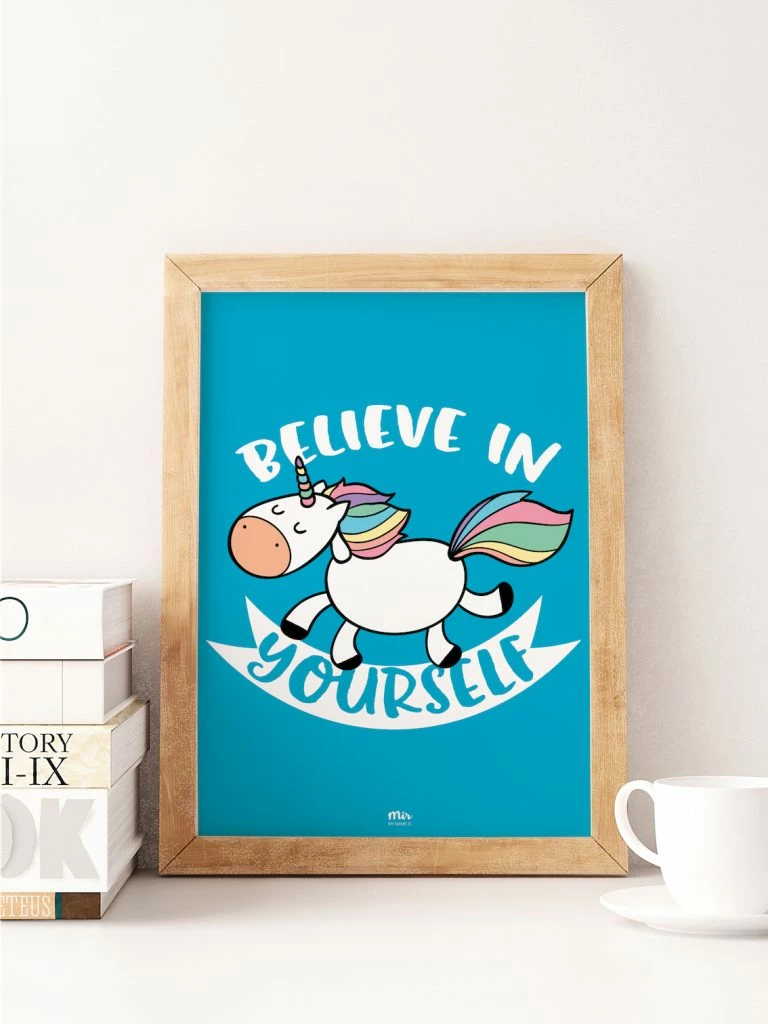 My Name is Mir Believe in Yourself Unicorn Blue Rainbow Kids Room Wall Print A3